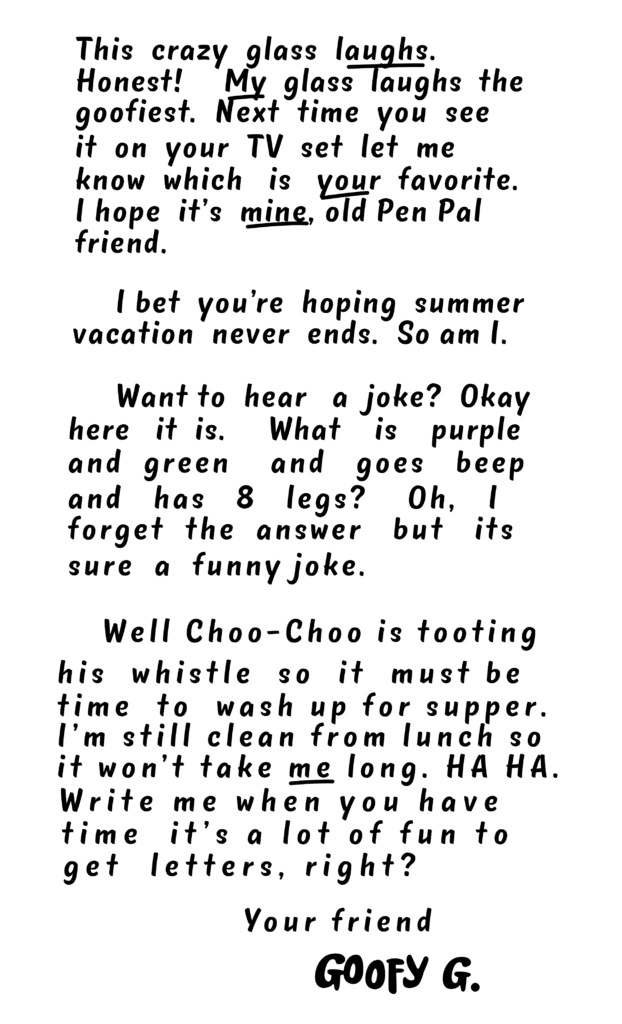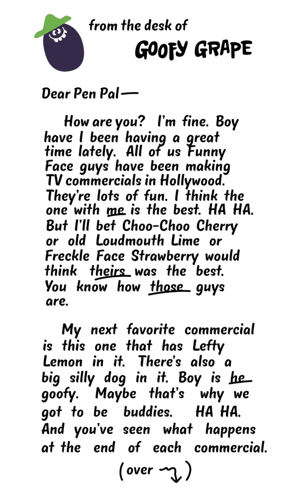 In 1967 Pillsbury ran a promotion where if you sent in two drink packets (per letter) they’d send you a letter from your favorite member of the Funny Face Gang along with 16 page Funny Face Fun Book.